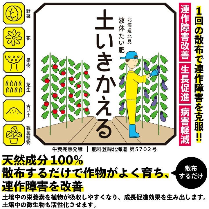他の画像を見る 天然成分100%!善玉活性水で連作障害改善 液体たい肥 土いきかえる 500ml 肥料登録北海道 第5702号 連作障害 善玉活性水 天然成分 病害対策 花 果樹 苗 野菜 芝生 バラ 土壌改良 無農薬 ボトルタイプ 販売価格 ¥ 1,980 税込 詳細を見る お気に入りに登録する