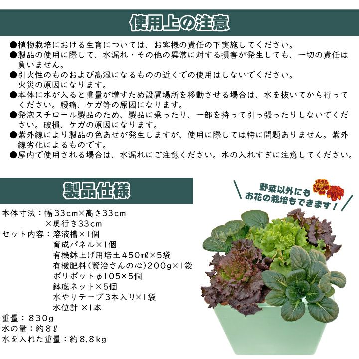 ・植物栽培における生育については、お客様の責任の下実施してください。
