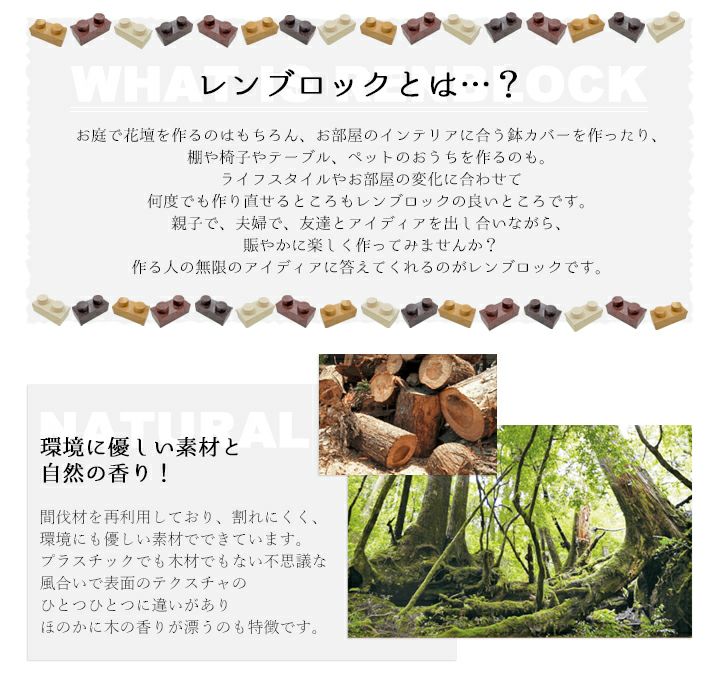 このレンガ調ブロック「レンブロック」は、子供のころ遊んだブロック遊びのように、自分で設計して組み立てて、いろいろなものが作れちゃう、遊び心溢れる商品です。