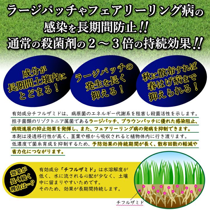 成分が長期間土壌に留まり、ラージパッチやフェアリーリング病の発生を長く抑制します。