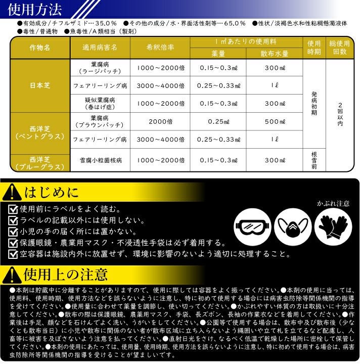 ・西洋芝全般(ベントグラス等 ※ティフトン芝含む)へは発病初期と根雪(雪が積もる)前に散布。