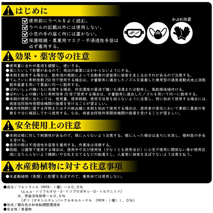 ・蚕に対して影響があるので、周辺の桑葉にはかからないようにする。