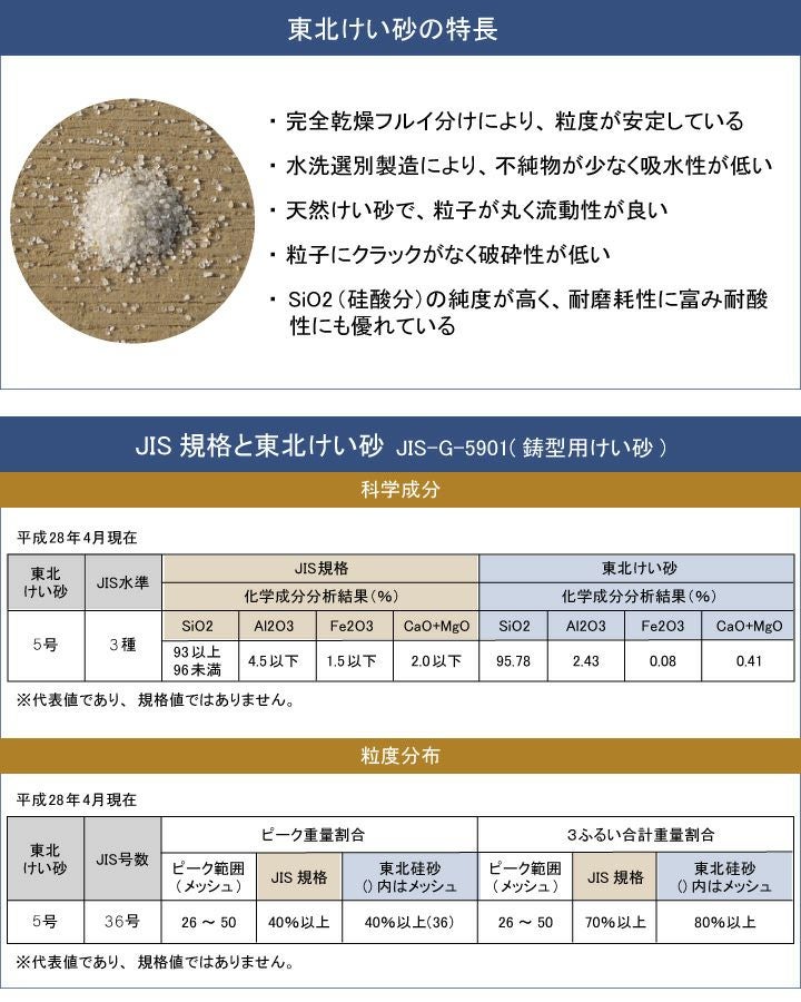 山形県産のけい砂は、川砂や海砂等に比べ雑石(ざっせき)が少なく、粒形が丸いので、踏圧(踏まれたりすること)による粉砕(ふんさい)が少ないという利点があります。このため、強風や使用時における砂ぼこりが発生しません。