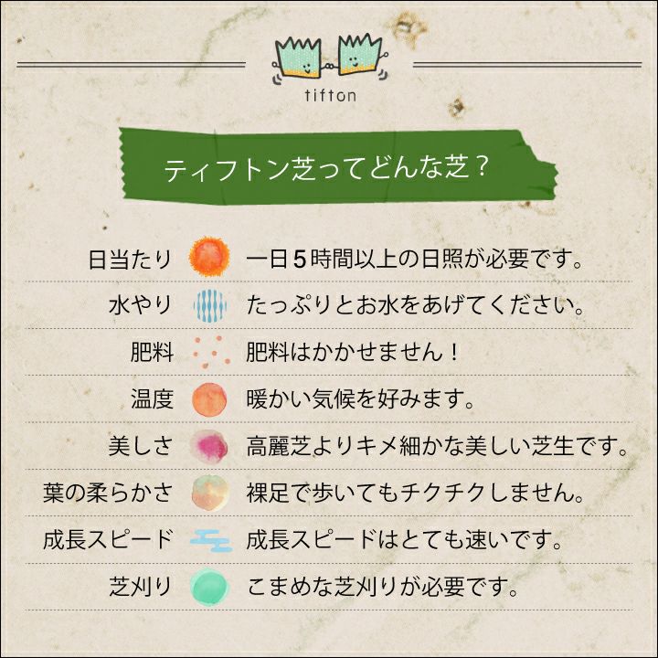 他の画像を見る 魔法のようにぐんぐん伸びる天然芝生。踏圧にも強い! ティフトン芝 ポット苗(キューブ苗)ティフトン芝419 50苗 【10平米分】暖地型西洋芝生:レビューを書いたら次回使える5%OFFクーポン&肥料プレゼント!擦り切れや踏圧に強い暖地型西洋芝生 予約商品 こちらは予約商品です 予約販売価格 ¥ 5,830 税込 予約受付期間 2026/03/16 0:00 〜 2026/03/31 23:59 詳細を見る お気に入りに登録する