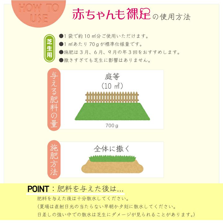 ●散布し過ぎても、芝生に影響はありませんが、3月・6月・9月の年3回の施肥をオススメ。