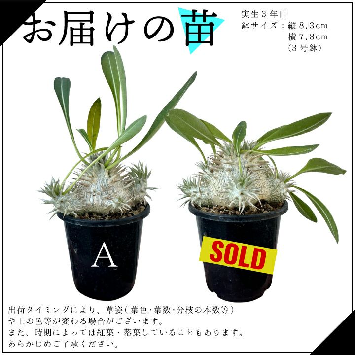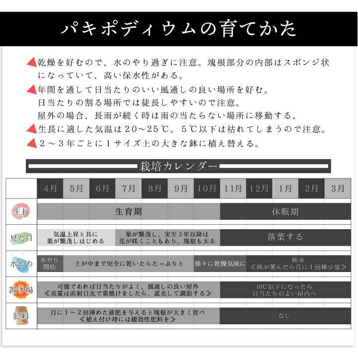 他の画像を見る 人気の塊根植物 パキポディウム グラキリス 実生2年目 2.5号鉢 塊根植物 コーデクッス 観葉植物 人気種 キョウチクトウ科 パキポディウム属 Pachypodium gracilius 販売価格 ¥ 4,950 税込 詳細を見る お気に入りに登録する