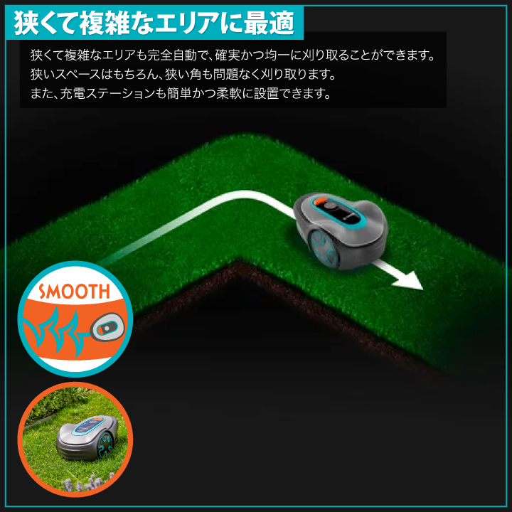 ・小さなスペースに最適:狭く複雑な芝生スペースでの芝刈りに活躍するコンパクトなタイプのロボット芝刈り機 SILENO minimo。
