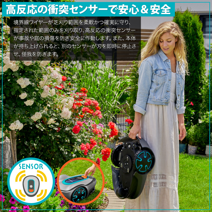 ・衝突センサー機能:芝刈り機が障害物にあたっても停止せず、方向を変えて走行しなおす。