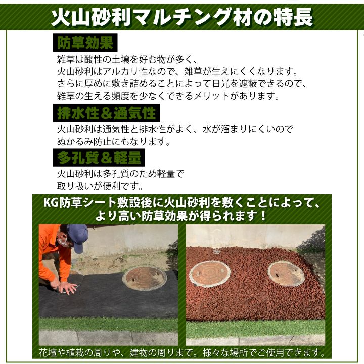 他の画像を見る 花壇や植栽の周り、建物の周りまで!様々な場所でご使用できます。 火山砂利マルチング材22kg 粒形1~2cm 雑草対策 雑草防止 乾燥防止 防草効果 雑草抑制 軽量 多孔質 アルカリ性 マルチング材 伊豆火山岩 国産 ガーデニング 植木周り アプローチ エクステリア 砂利 ジャリ 庭 外構 保水 植栽周り 駐車場スリット 販売価格 ¥ 4,620 税込 詳細を見る お気に入りに登録する