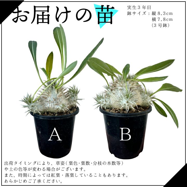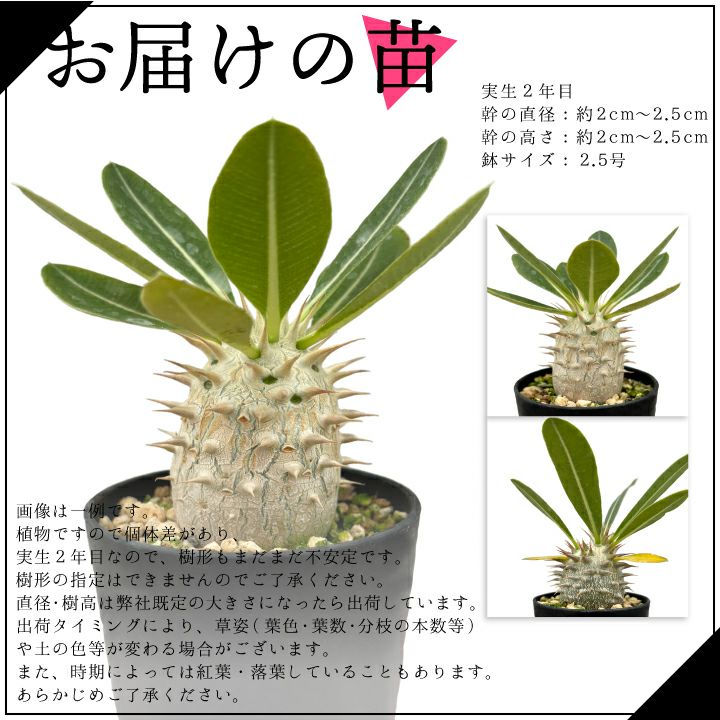 他の画像を見る 人気の塊根植物 パキポディウム デンシフローラム 実生2年目 2.5号鉢 塊根植物 コーデクッス 観葉植物 人気種 キョウチクトウ科 パキポディウム属 Pachypodium densiflorum 販売価格 ¥ 4,180 税込 詳細を見る お気に入りに登録する