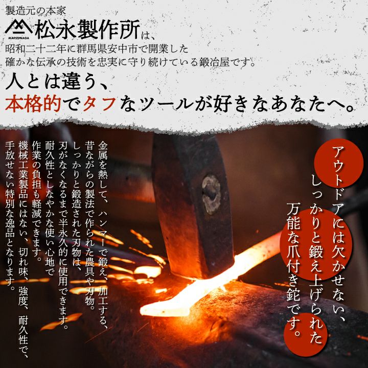他の画像を見る 爪付きなので刃がかけにくく柄が長く持ちやすい本格鉈! 松永製作所 爪付き鉈 刃渡り17cm 両刃 ナタ 薪割り 鍛冶屋 本格鉈 アウトドア 半永久 枝打ち 長持ち 研いで使う 万能 逸品 販売価格 ¥ 14,300 税込 詳細を見る お気に入りに登録する