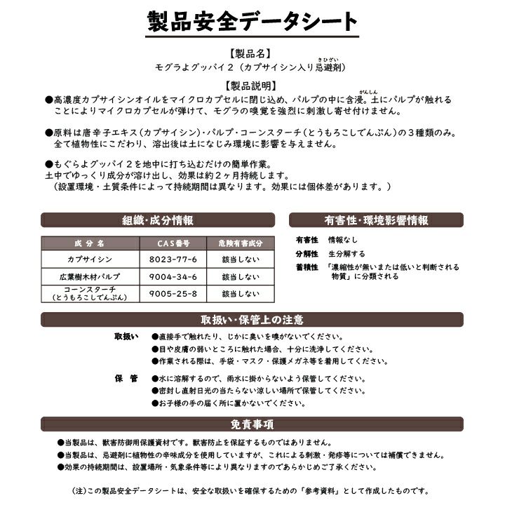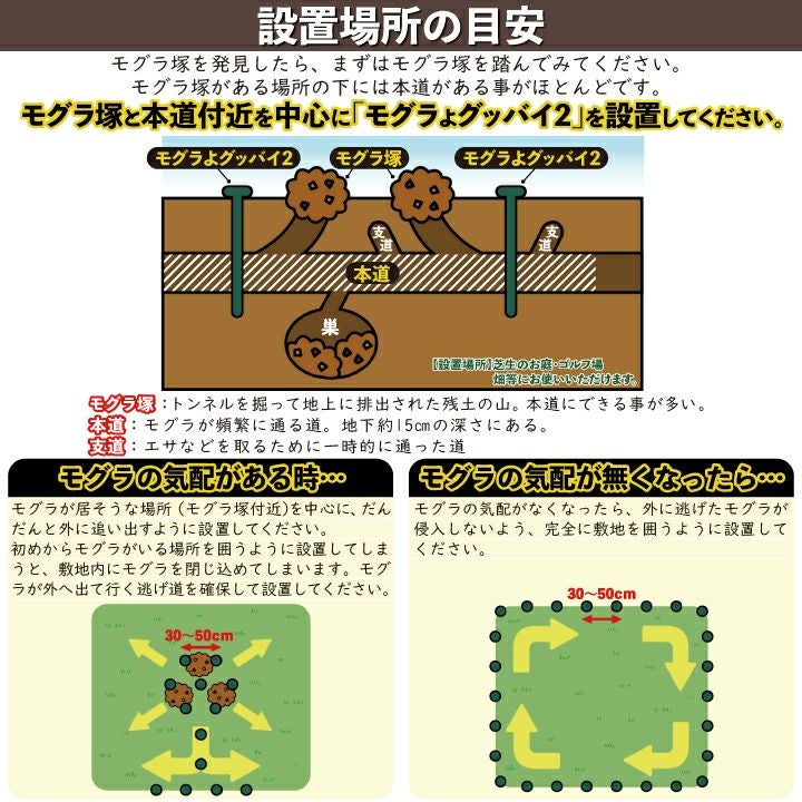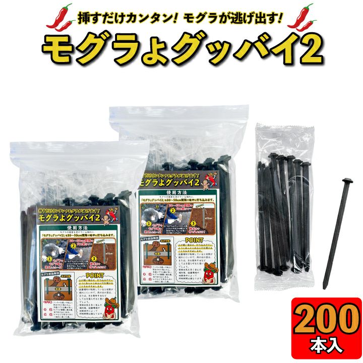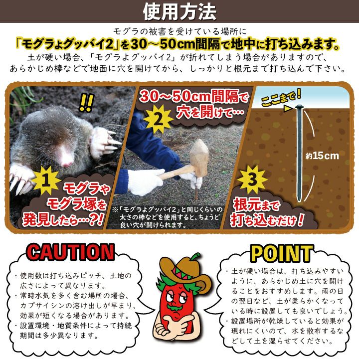 他の画像を見る 唐辛子入りでモグラ撃退!もぐら退治!天然成分だから植物に優しい。 モグラよグッバイ2(お試し用20本入り)モグラ退治方法 モグラ 撃退 もぐら 退治 モグラよけ モグラ 対策に:パワーアップして登場!唐辛子入りでモグラ撃退! 販売価格 ¥ 2,970 税込 詳細を見る お気に入りに登録する