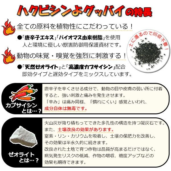 他の画像を見る 唐辛子入りでモグラ撃退!もぐら退治!天然成分だから植物に優しい。 モグラよグッバイ2(50本入)モグラ 撃退 もぐら 退治 モグラよけ モグラ退治方法 モグラ 対策に パワーアップして登場!唐辛子入りでモグラ撃退! 販売価格 ¥ 5,060 税込 詳細を見る お気に入りに登録する