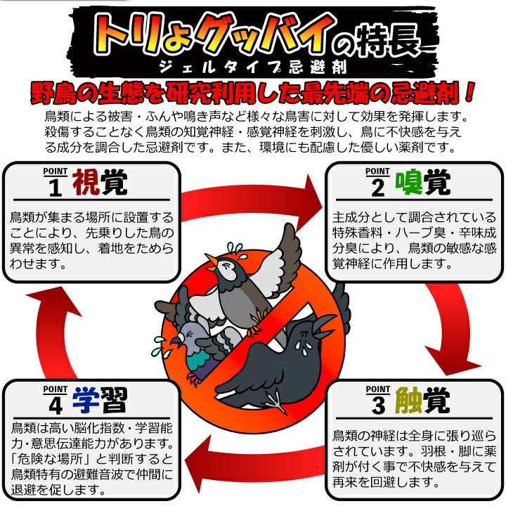 鳥類の知覚神経・感覚神経を刺激し、鳥に不快感を与える成分を調合した忌避剤です。