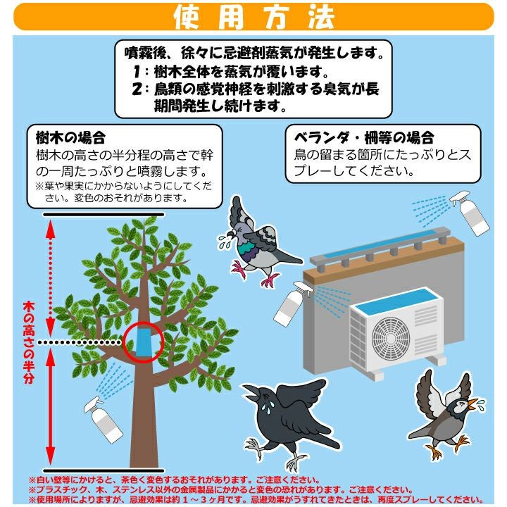 ベランダ・棚等の場合:鳥の止まる箇所にたっぷりとスプレーして下さい。