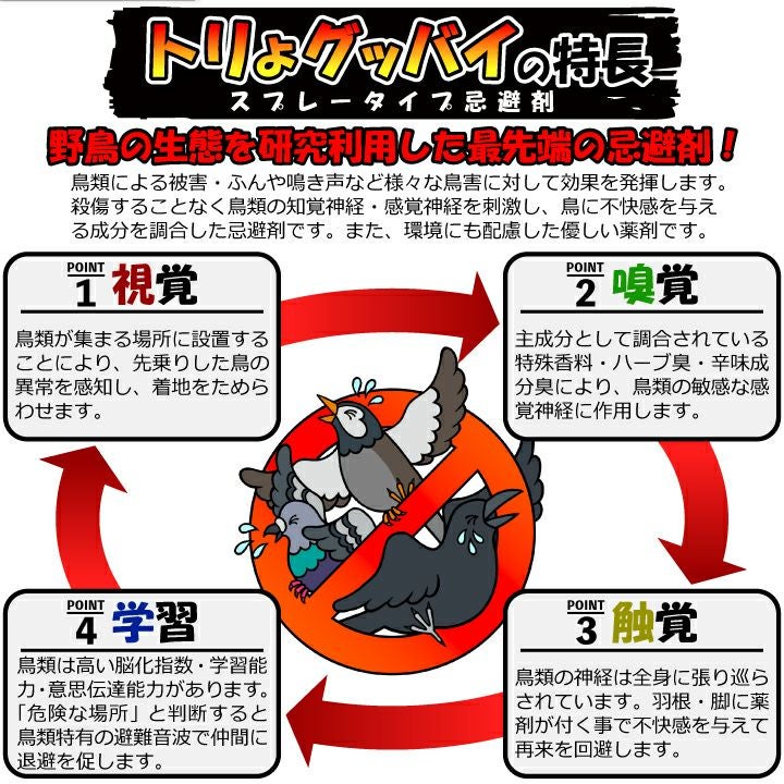 ・鳥類の排泄物の除去・忌避以外の用途以外に使用しないでください。