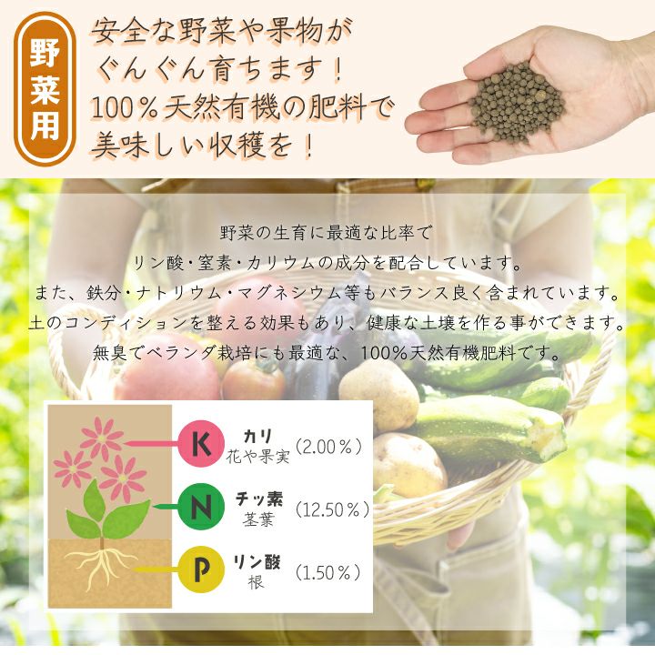 ・100%有機肥料…安心・安全で、美味しい野菜や果物を栽培することができます。