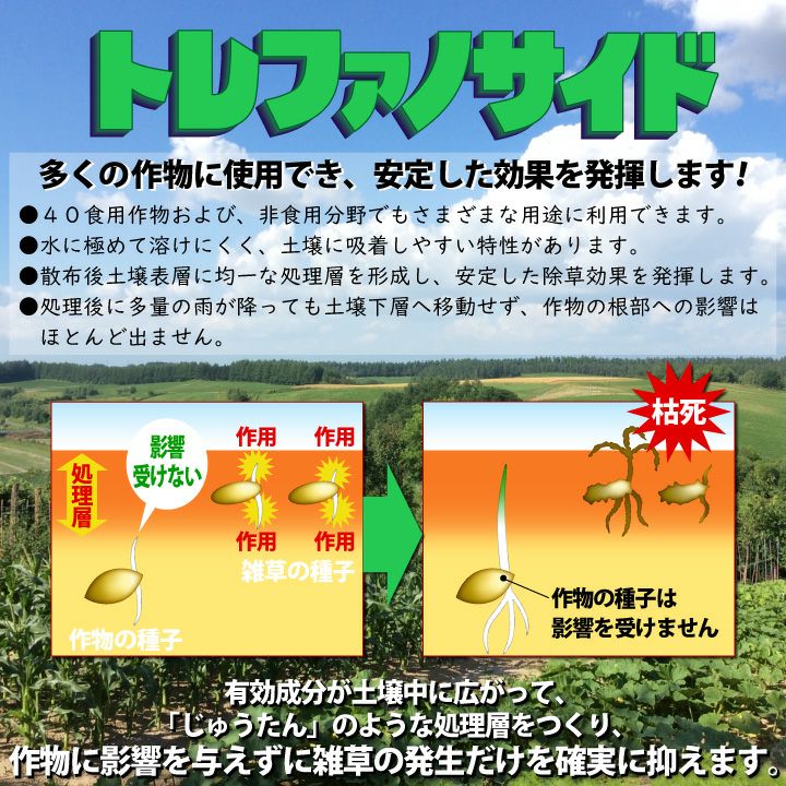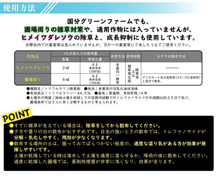 他の画像を見る 食用作物、野菜などに使用可能!当店でも圃場周りに使用しています。 【送料無料】除草剤 トレファノサイド乳剤 500ml 野菜 栽培 雑草予防 雑草対策 農薬 ガーデニング ガーデン用品 農作業 道具 園芸用品 農業用品 農業用資材 農業資材 販売価格 ¥ 3,905 税込 詳細を見る お気に入りに登録する