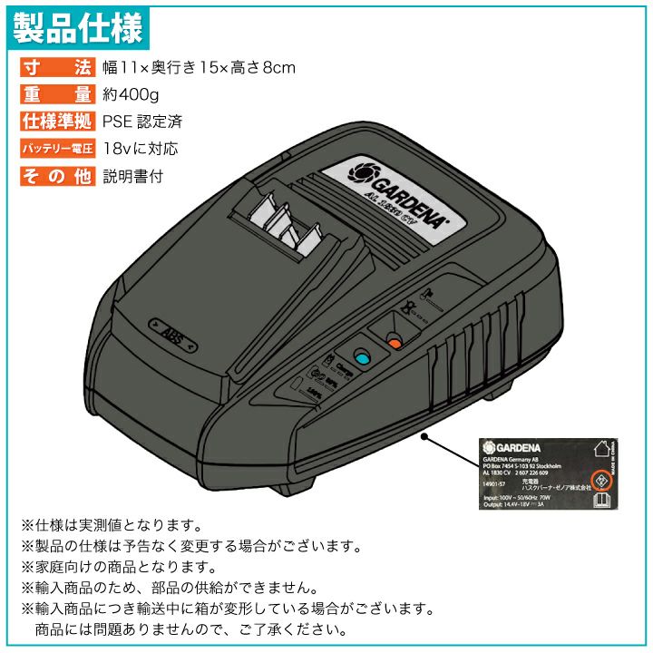 他の画像を見る 18Vバッテリー専用急速充電器 PSE認証済で安心 GARDENA クイックチャージャー 18Vバッテリー専用充電器 AL1830 CV JP(急速充電器) 1台 PSE認証済 14901-57 ※バッテリーは付属していません 販売価格 ¥ 7,700 税込 詳細を見る お気に入りに登録する
