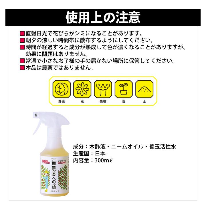 他の画像を見る 天然成分100%!散布するだけで虫や病気に強い作物へ 無農薬への道 スプレー 300ml ニームオイル 木酢液 善玉活性水 天然成分 害虫対策 病害対策 花 果樹 苗 野菜 バラ 虫よけ 無農薬 スプレータイプ 簡単 散布するだけ 販売価格 ¥ 1,980 税込 詳細を見る お気に入りに登録する