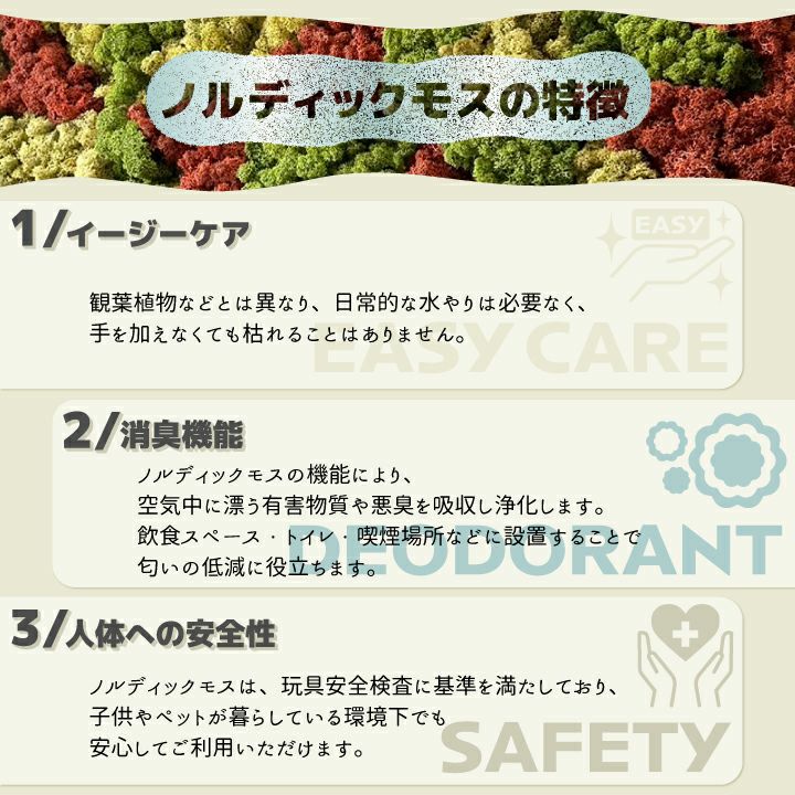 他の画像を見る お手入れ不要!100%天然のサスティナブル素材! 嫌なアンモニア臭や喫煙臭、飲食スペースなどを脱臭! 【送料無料】ノルディックモス 「ボックスモス」20色から選べる!お洒落なうえに脱臭・調湿効果抜群! PANELMOSS 空気清浄 消臭 調湿 吸音 100%天然素材 安心安全 苔 販売価格 ¥ 15,400 税込 詳細を見る お気に入りに登録する