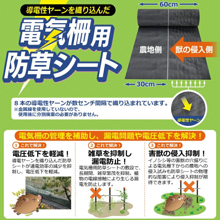 他の画像を見る 雑草繁茂と、害獣の侵入を抑制!導電性ヤーンを織り込んだ電気柵用の防草シート 電気柵用防草シート(W0.6×50m) 電気柵 電気柵管理 電圧低下 漏電防止 農作物被害 害獣対策 シカよけ イノシシ対策 雑草対策 防草効果 導電性 販売価格 ¥ 13,805 税込 カートに入れる お気に入りに登録する